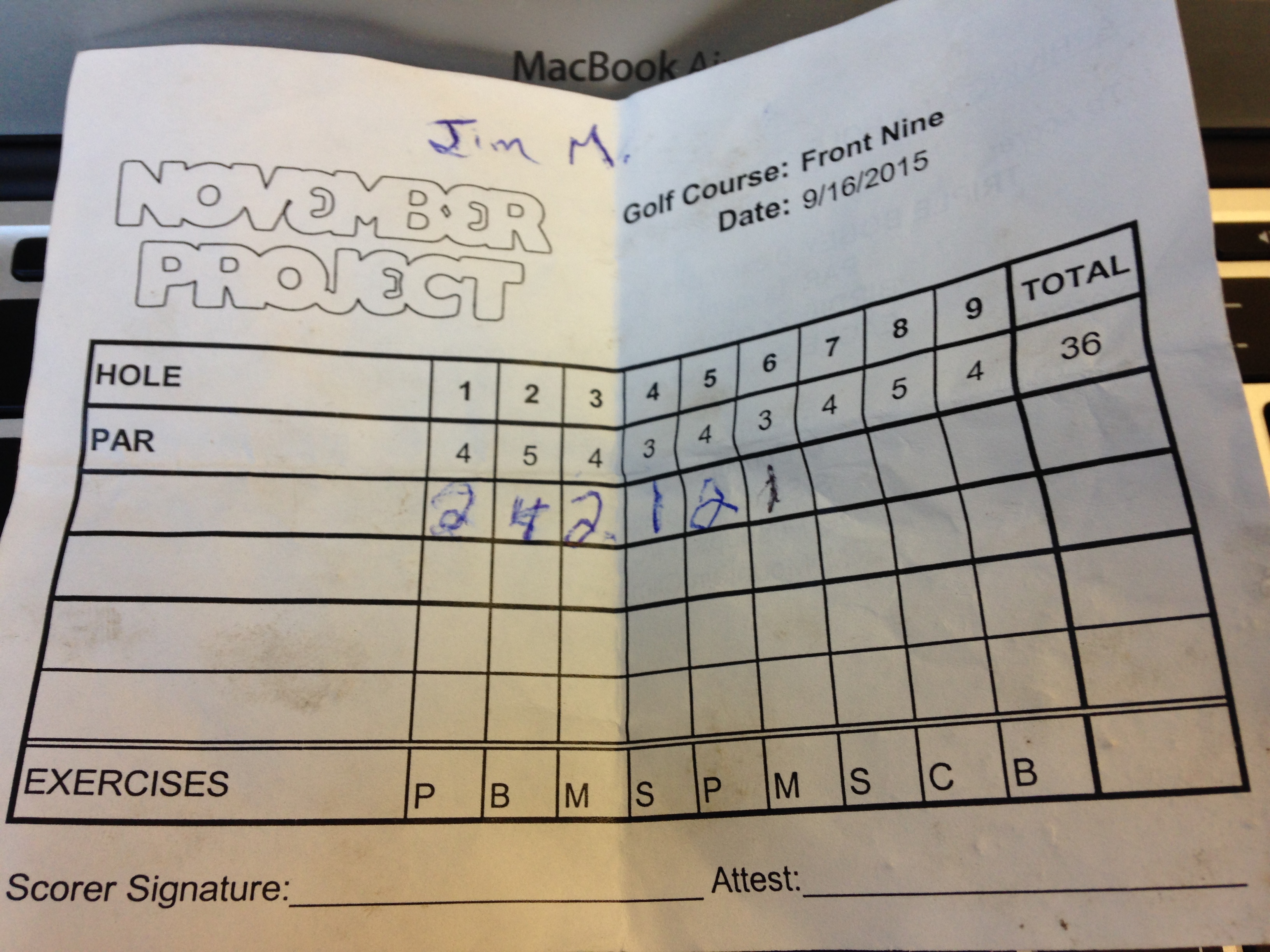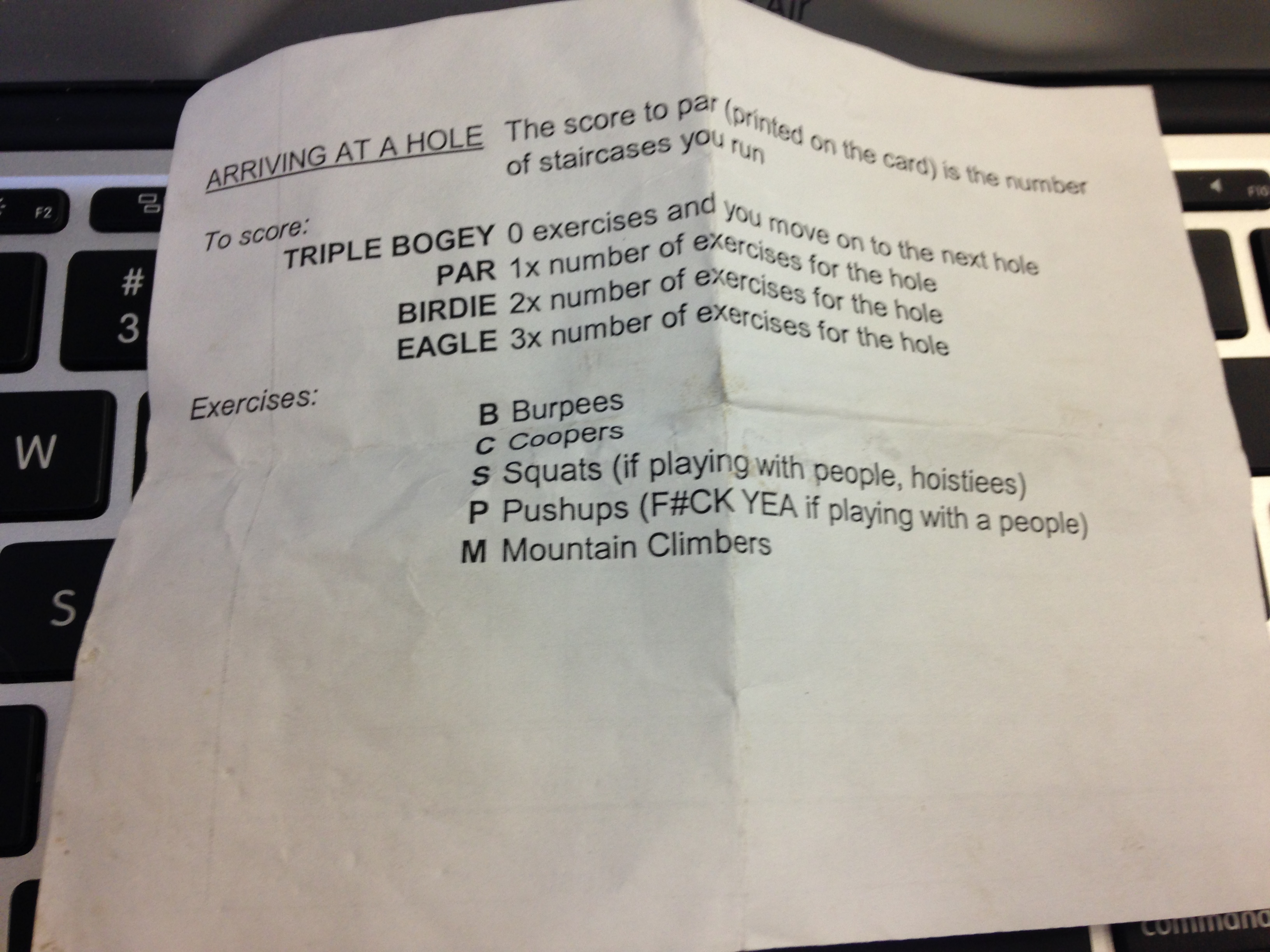 Here’s how the workout went down: Every “player” received a golf score card with nine “holes.” Each “hole” had a par and letter listed. The par indicated the number of stair loops you had to run for that particular “hole,” and the letter represented the exercise that you would do upon completing the running. So, for example, the first hole was a par four with a “P,” which meant that you would run four stair loops and then do pushups. To shoot par, you had to do four pushups. To birdie, you had to do eight; for eagle, 12. Players could partner up, but no groups larger than four (just like golf . . . get it?!).