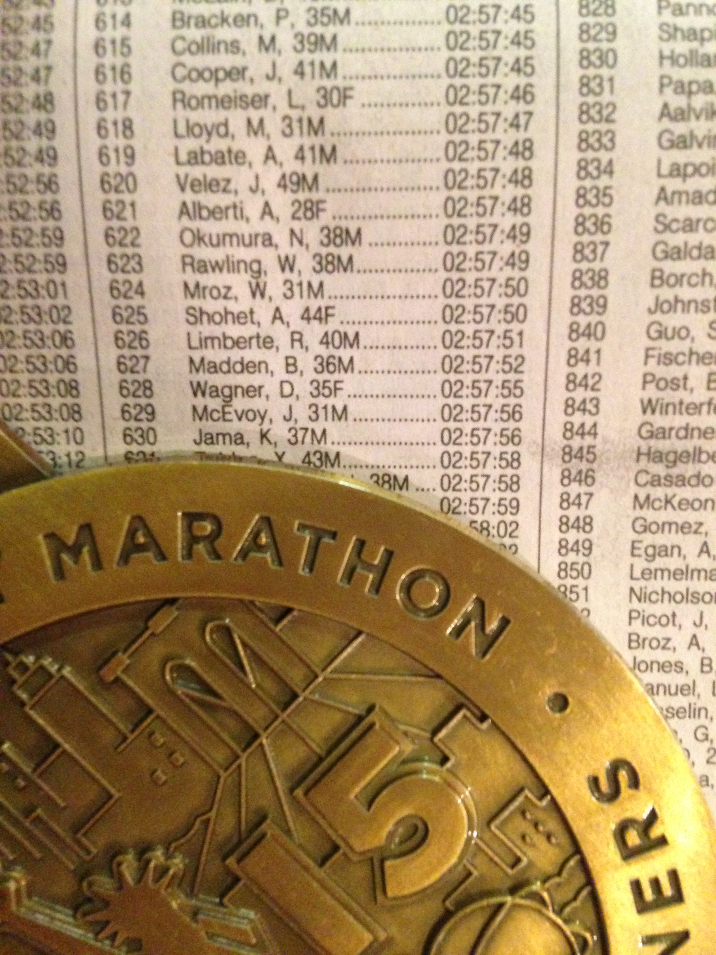 And then I turned and entered the Park. An announcer said, “Welcome to Central Park!” and I wooped! So close! So many people lined the barricades. I thought about everything that had happened to me over the past three years, how lucky I was to be running today, and how grateful I was for the people who helped me through the toughest time in my life, at times literally picking me up off the ground. I passed more runners and worked my arms. On the final uphill, I spotted the finish line clock: 2:58:40. 10 seconds to finish sub-2:58 (I started 50 seconds after the gun). I sprinted through the finish line in what I thought was 2:58:50 exactly. Success! Completion! The culmination of so much more than training runs and nutrition plans. Tears welled into my eyes.