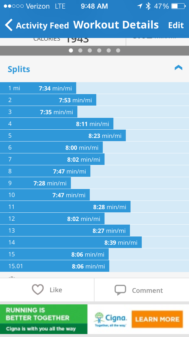That said, here are my mile splits for the day. They look different from last week’s group run, which makes sense because when I train using the “180 Formula,” I have to slow down on the hills, and then I run faster on the downhills. Overall, though my pace was almost exactly the same as last week’s (about 8 miles per mile, a solid long run training pace).